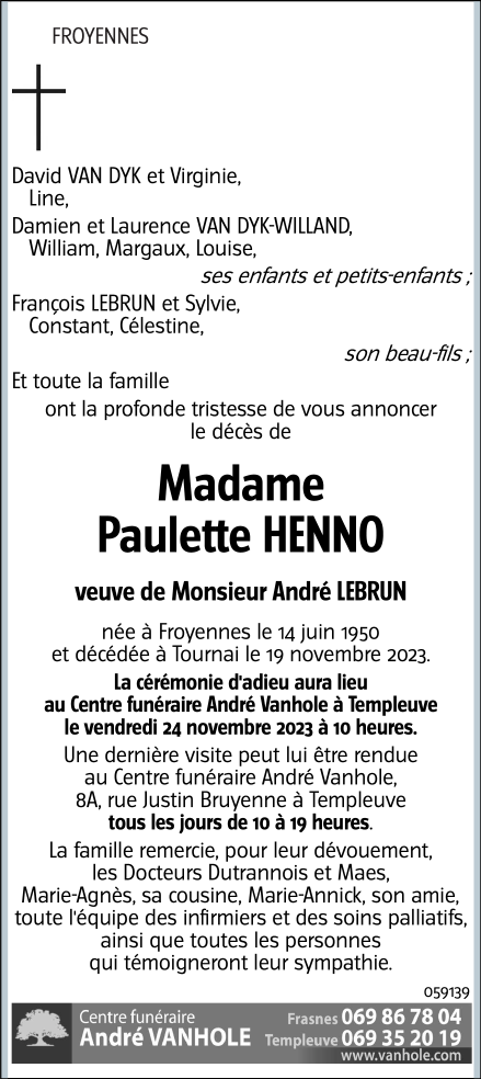 Décédée à Tournai (7500) le dimanche 19 novembre 2023 à l'âge de 73 ans