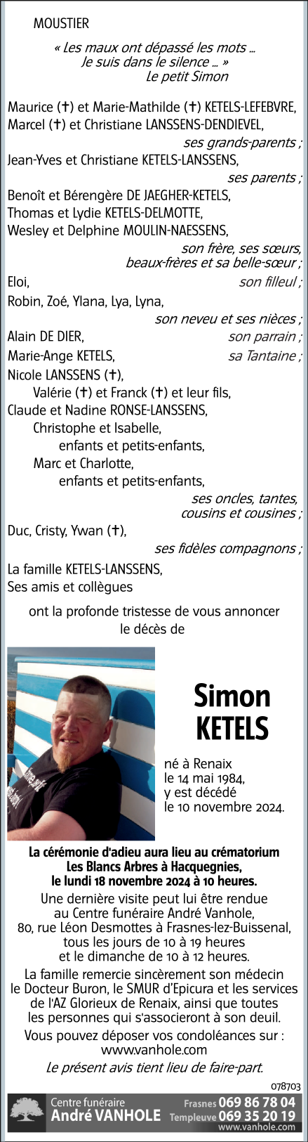 Décédé à Renaix (9600) le dimanche 10 novembre 2024 à l'âge de 40 ans