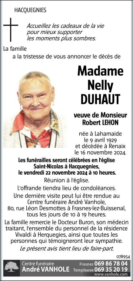 Décédée à Renaix (9600) le samedi 16 novembre 2024 à l'âge de 95 ans