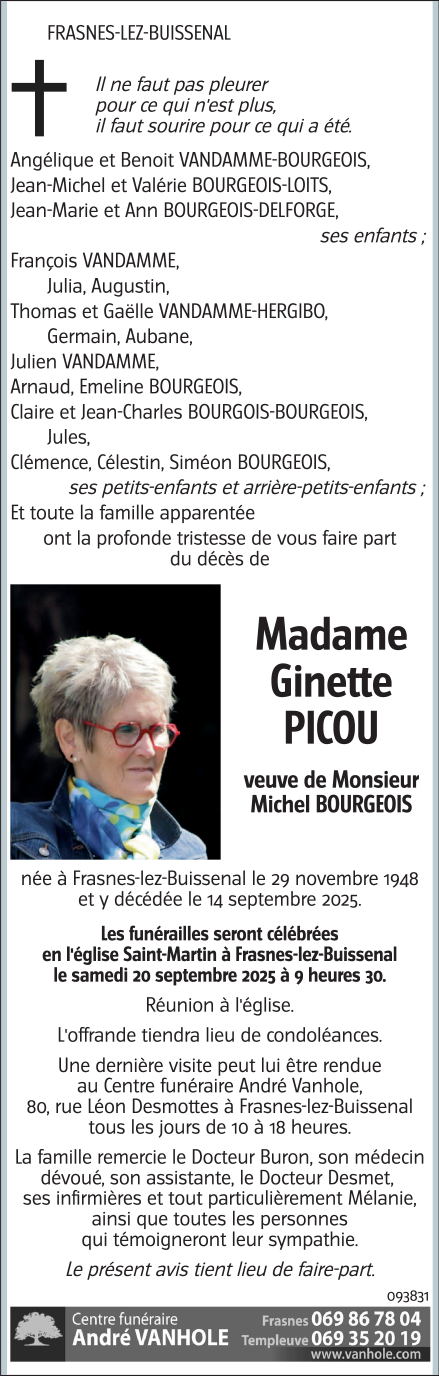 Décédée à Frasnes-lez-Buissenal (7911) le dimanche 14 septembre 2025 à l'âge de 76 ans