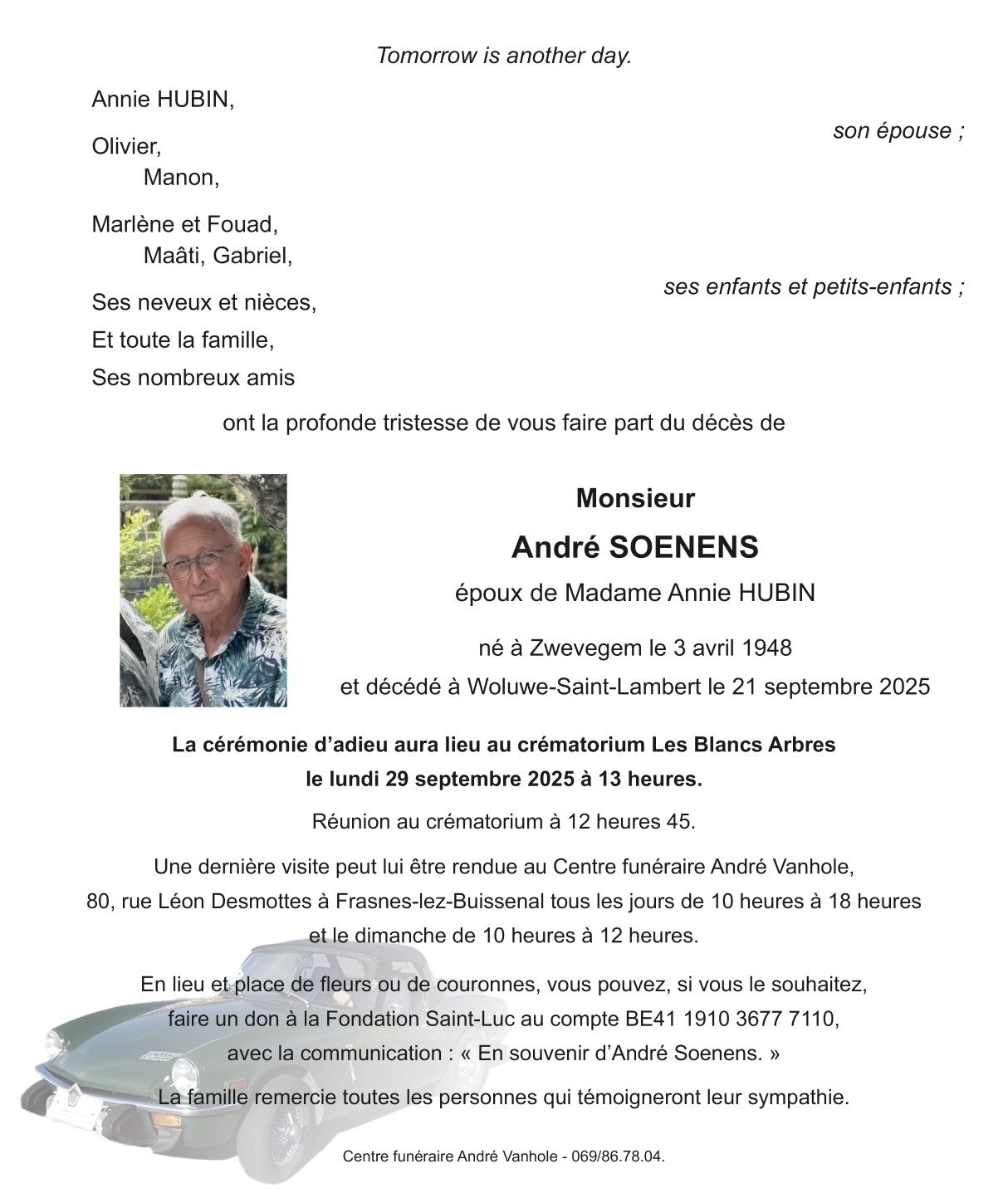 Décédé à Woluwe-Saint-Lambert (1200) le dimanche 21 septembre 2025 à l'âge de 77 ans