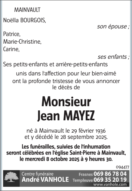 Décédé à Mainvault (7812) le dimanche 28 septembre 2025 à l'âge de 89 ans