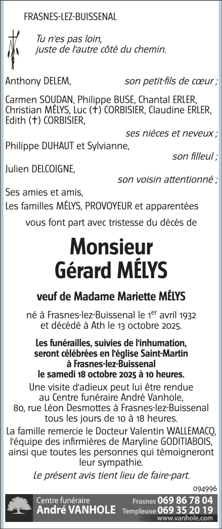Décédé à Ath (7800) le lundi 13 octobre 2025 à l'âge de 93 ans