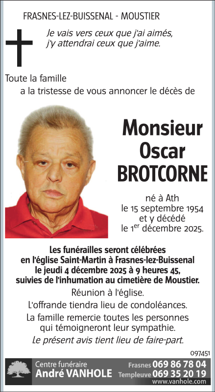 Décédé à Ath (7800) le lundi 1 décembre 2025 à l'âge de 71 ans