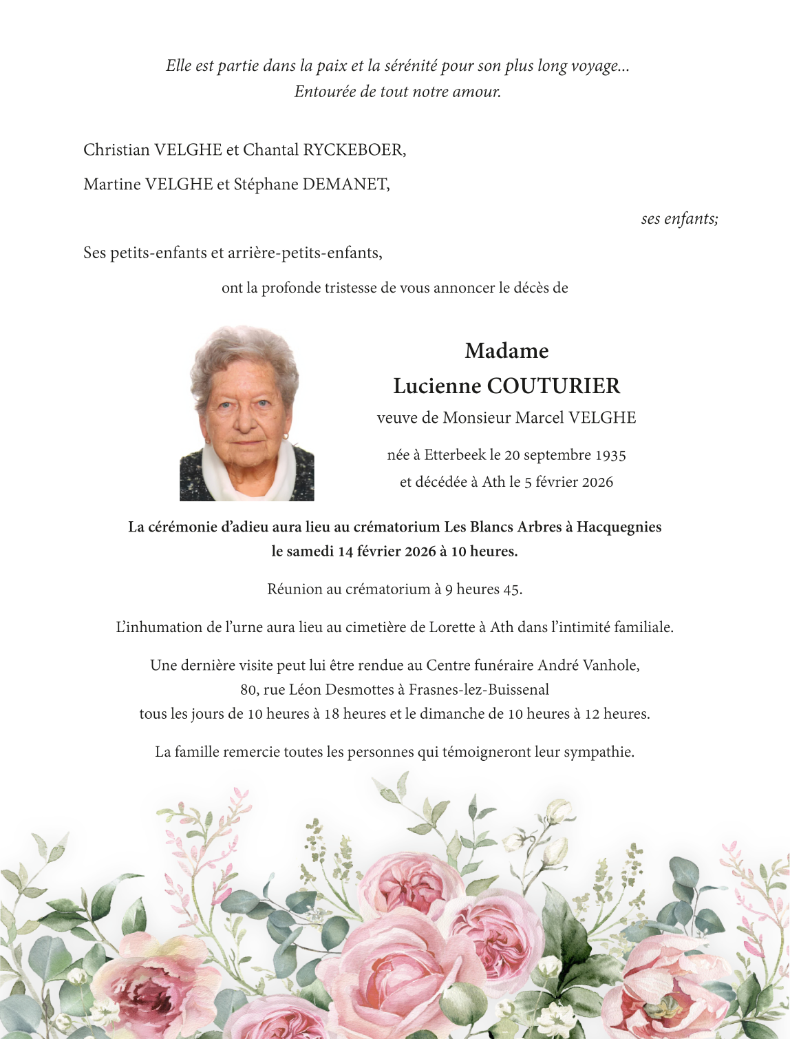 Décédée à Ath (7800) le jeudi 5 février 2026 à l'âge de 90 ans