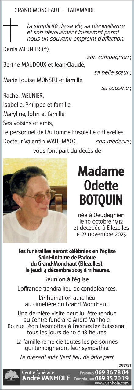 Décédée à Ellezelles (7890) le jeudi 27 novembre 2025 à l'âge de 93 ans