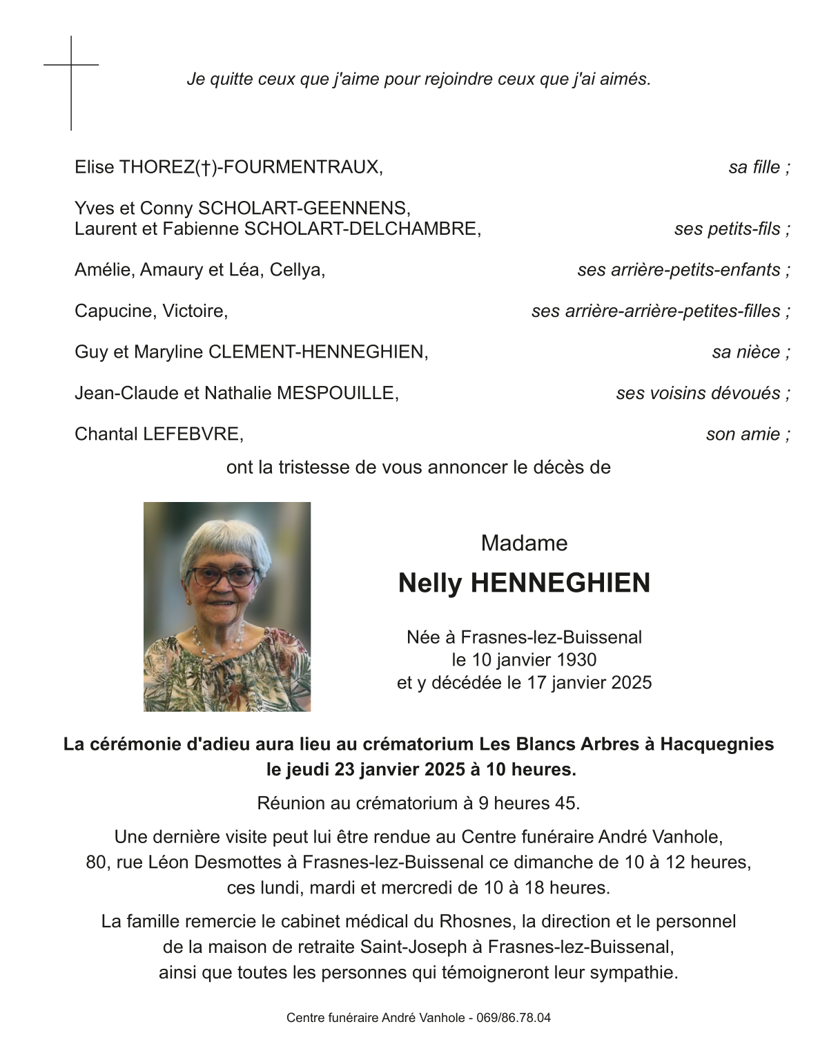Décédée à Frasnes-lez-Buissenal (7911) le vendredi 17 janvier 2025 à l'âge de 95 ans