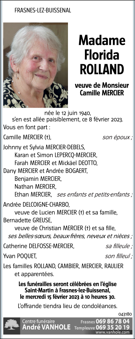 Née à Frasnes-lez-Buissenal (7911) le mercredi 12 juin 1940