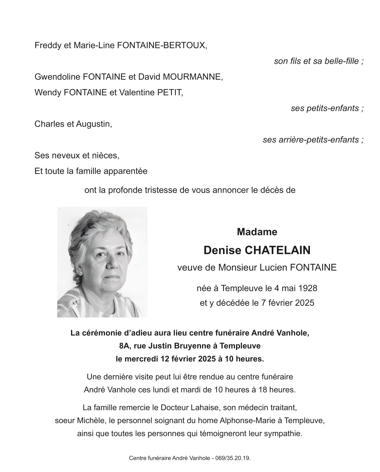 Décédée à Templeuve (7520) le vendredi 7 février 2025 à l'âge de 96 ans