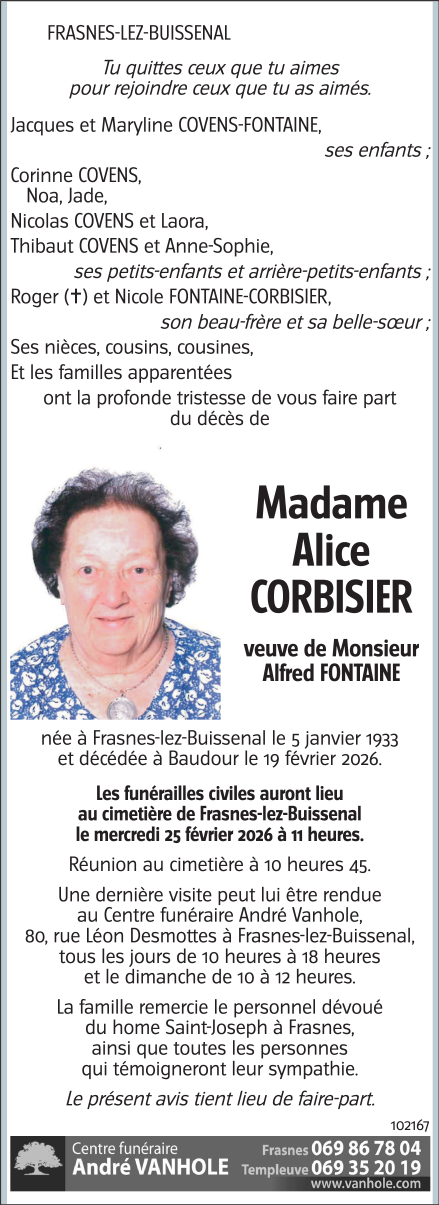 Née à Frasnes-lez-Buissenal (7911) le jeudi 5 janvier 1933