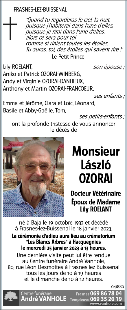 Décédé à Frasnes-lez-Buissenal (7911) le mercredi 18 janvier 2023 à l'âge de 89 ans